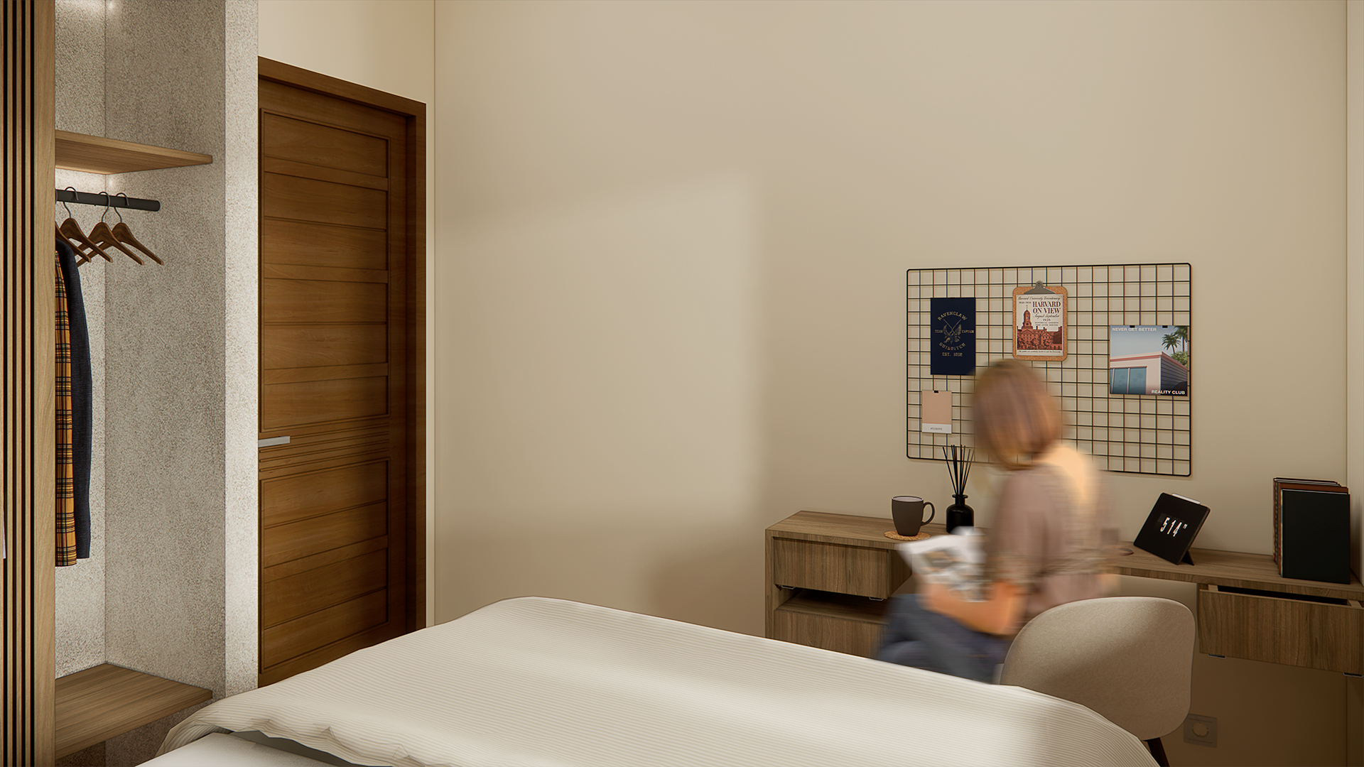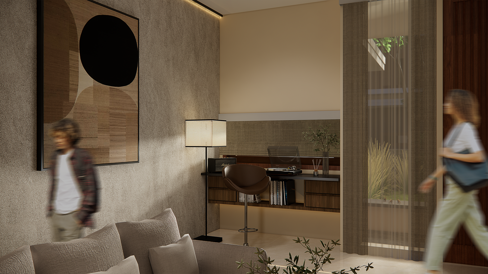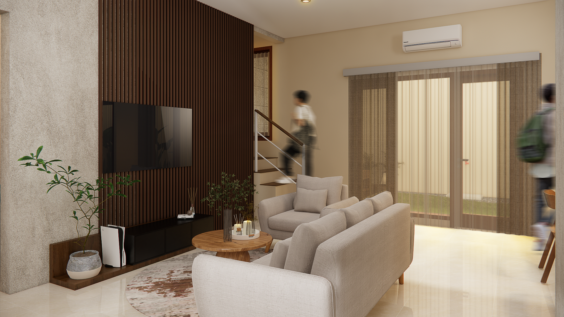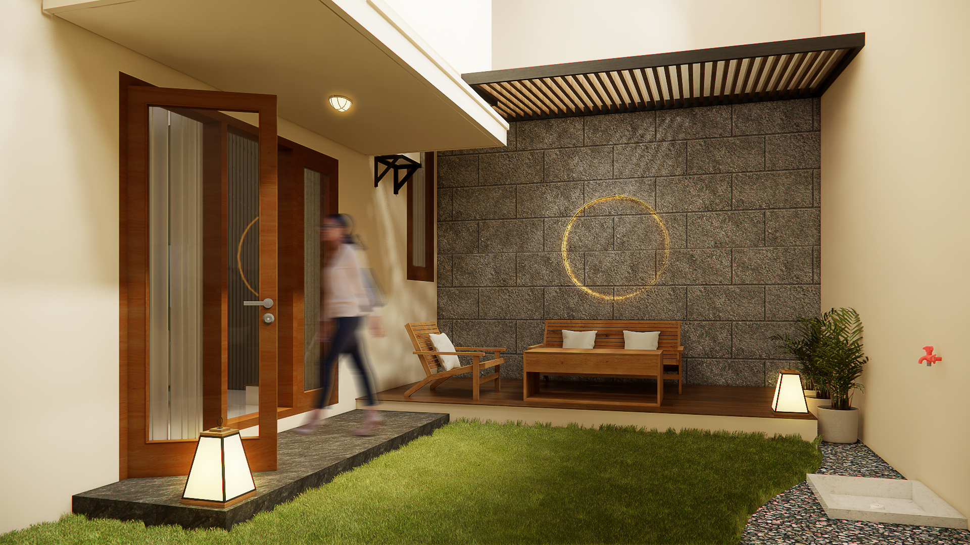Proyek ini didesain atas perpaduan antara bentuk bangunan minimalis dengan sentuhan Japandi, sebuah kombinasi gaya Jepang dan Scandinavian. Desain menekankan kesederhanaan, fungsionalitas, dan apresiasi terhadap material alami. Sebagai rumah tinggal untuk keluarga, setiap aspek desain disesuaikan dengan kebutuhan dan karakter penggunanya. Keselarasan antara dua gaya yang berbeda melahirkan harmoni yang dibuat sedemikian rupa sehingga tercipta sebuah ruang inspirasi bagi penghuninya.Sebagai muka bangunan yang akan menyambut penghuninya, ditambahkan elemen lis kayu yang diselaraskan dengan corak bangunannya. Desain taman depan terinspirasi oleh gaya taman jepang yang sederhana, dipadukan dengan pemilihan jenis tanaman yang mampu menekankan batas ruang luar dan dalam. Untuk memberi identitas rumah yang lebih eksplisit, nomor rumah dibuat menggunakan corak material alami batu dengan pencahayan ambient lighting.