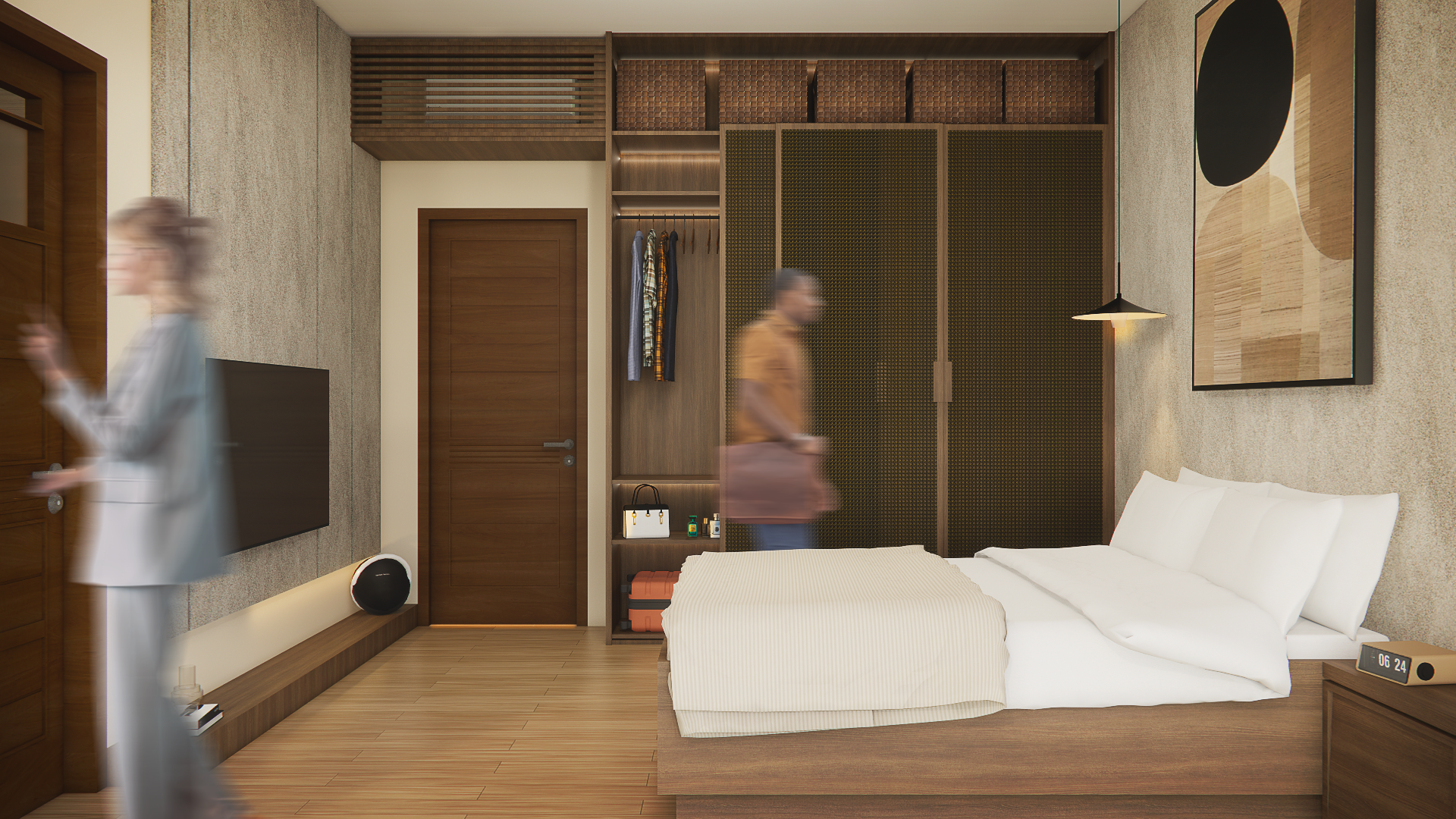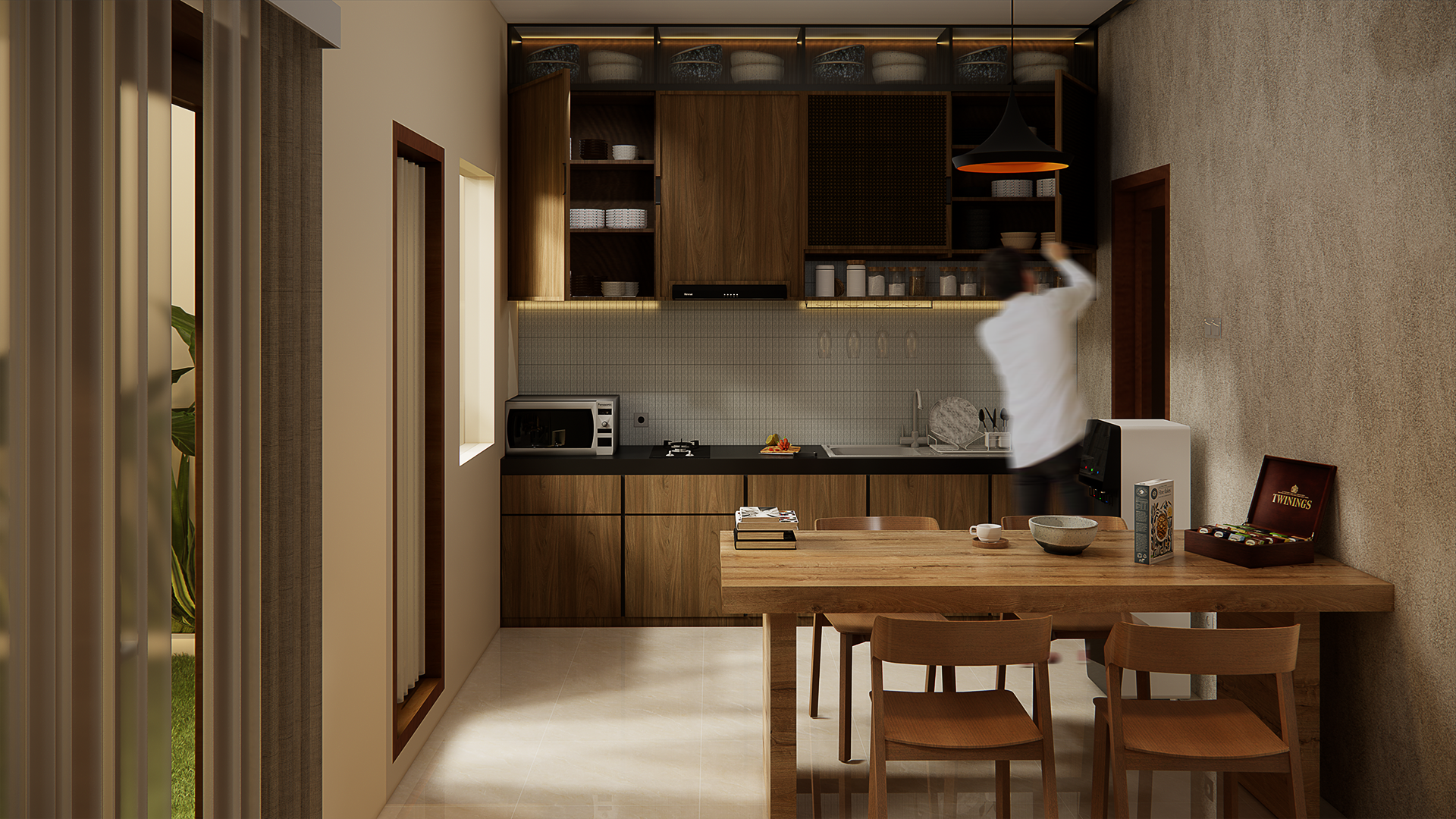 Sentuhan gaya jepang yang kental dapat dengan mudah dikenali melalui penggunaan elemen kayu bernada hangat pada furnitur dan dekorasi tiap-tiap ruangnya. Peran elemen kasar seperti batu dan limewashed wall adalah sebagai penyeimbang corak kayu yang halus. Menaruh fokus pada pemaksimalan ruang, desain memastikan tidak ada ruang kosong yang tertinggal tanpa sebuah fungsi yang jelas, namun dirancang dengan hati-hati sehingga tidak membuat rumah menjadi riuh.Meja makan kayu berperan sebagai penyekat semu antara ruang tengah dan dapur. Elemen ini memungkinkan pemisahan aktivitas sosial antar ruang, namun tetap saling terintegrasi dengan mulus. Meski diposisikan bertolak belakang, pengguna kedua ruang tetap dapat berinteraksi satu sama lain. Untuk mengakomodasi kebutuhan sosial penggunanya, ditambahkan area duduk dan bersantai pada taman belakang. Perpaduan elemen natural rumput, batu, dan kayu dengan warna hangat membuat keselarasan antara suasana ruang dalam dan luarnya. Dinding belakang terinspirasi oleh corak desain Zen dari Jepang, dengan sebuah elemen sederhana mampu membuat satu point of interest.