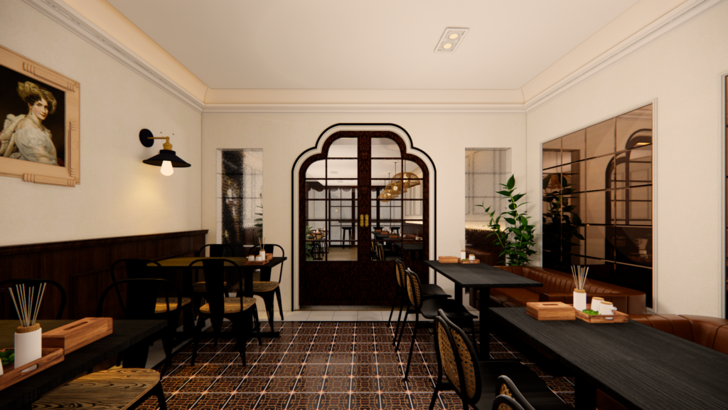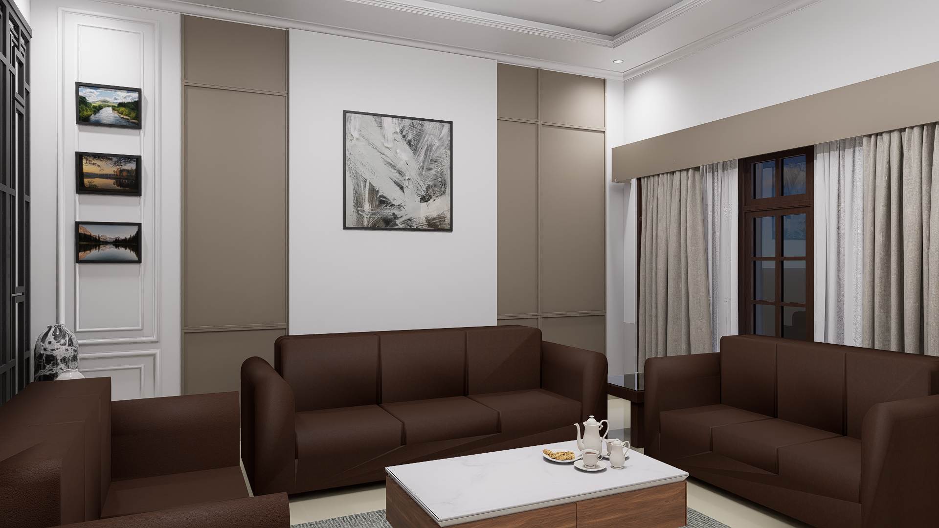 Ruang tamu dan living room ditata dengan sekat partisi fleksibel yang dapat dibuka dan ditutup sesuai kebutuhan. Hal ini memungkinkan rumah beradaptasi saat digunakan untuk acara keluarga besar, sekaligus tetap nyaman untuk aktivitas sehari-hari. Arah desain untuk area publik dipilih ke gaya clean classic dengan dominasi warna putih dan aksen beige. Hasilnya adalah kombinasi ruang yang hangat, bersih, dan fungsional, mampu menampung dinamika keseharian sekaligus momen kebersamaan dalam skala besar.