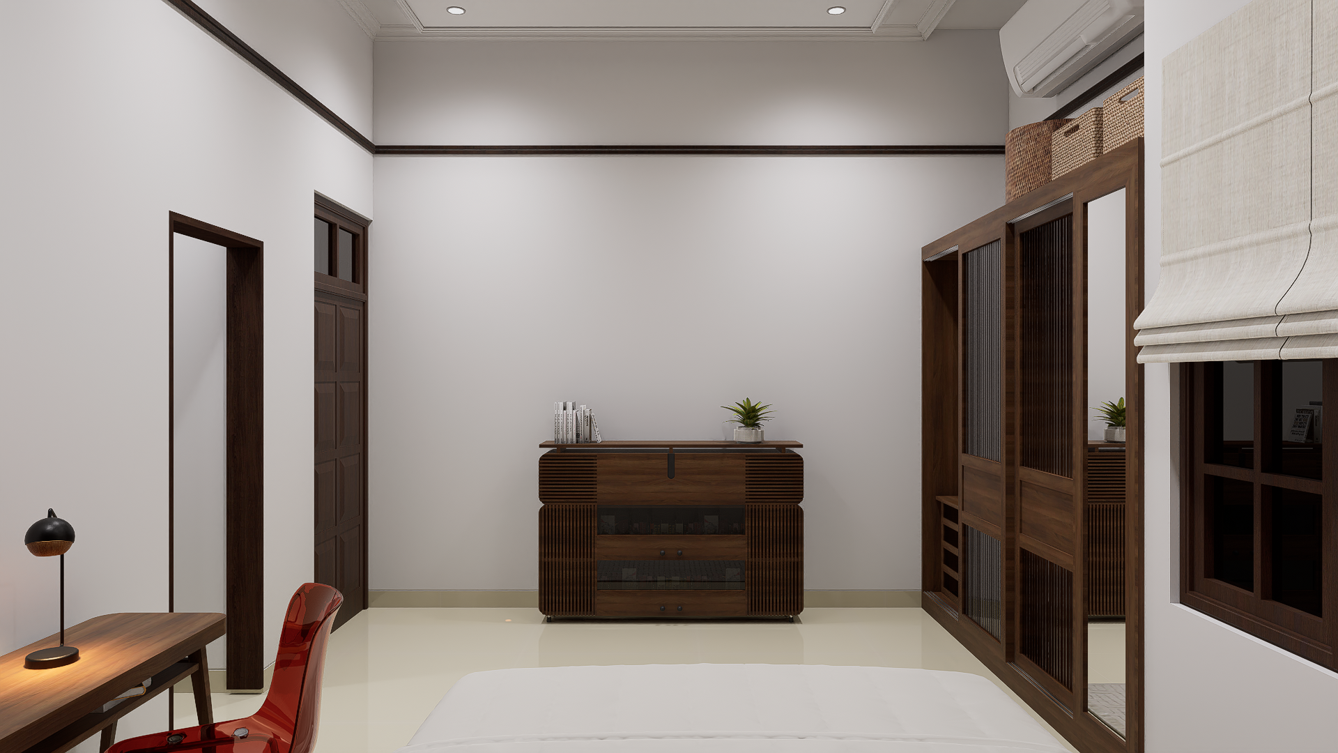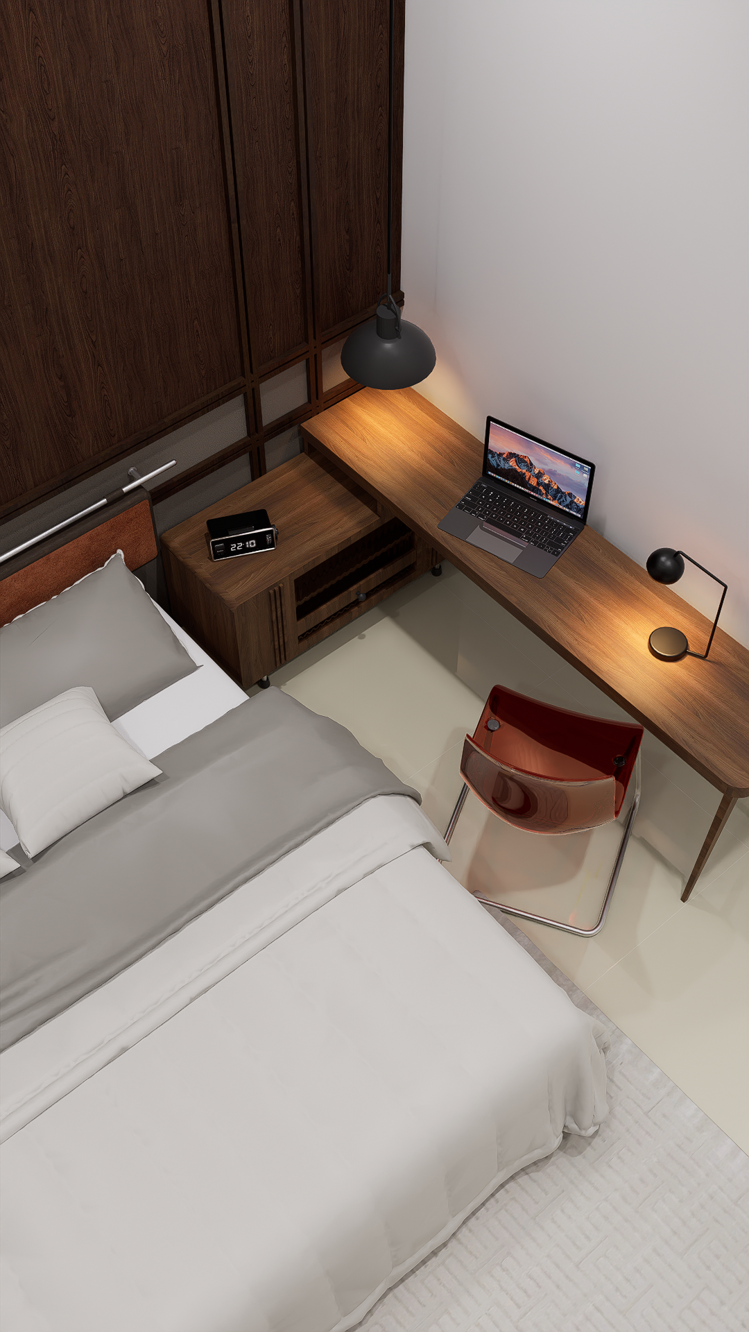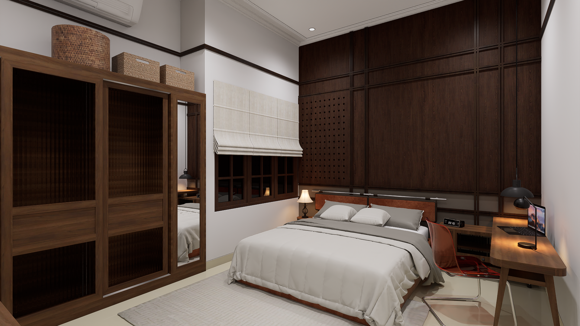 Renovasi Rumah Ceper mencakup tiga area utama: ruang tidur, ruang tamu, dan living room. Setiap ruang dirancang ulang sesuai kebutuhan pengguna, dengan fokus pada fungsi harian sekaligus fleksibilitas untuk aktivitas keluarga. Desain kamar tidur diarahkan ke nuansa semi mid-century. Untuk mendukung aktivitas penggunanya yang masih kuliah dan gemar membaca, ditambahkan peg board interaktif serta rak buku sebagai showcase kecil. Elemen ini tidak hanya berfungsi praktis, tetapi juga menjadi aksen visual yang personal.