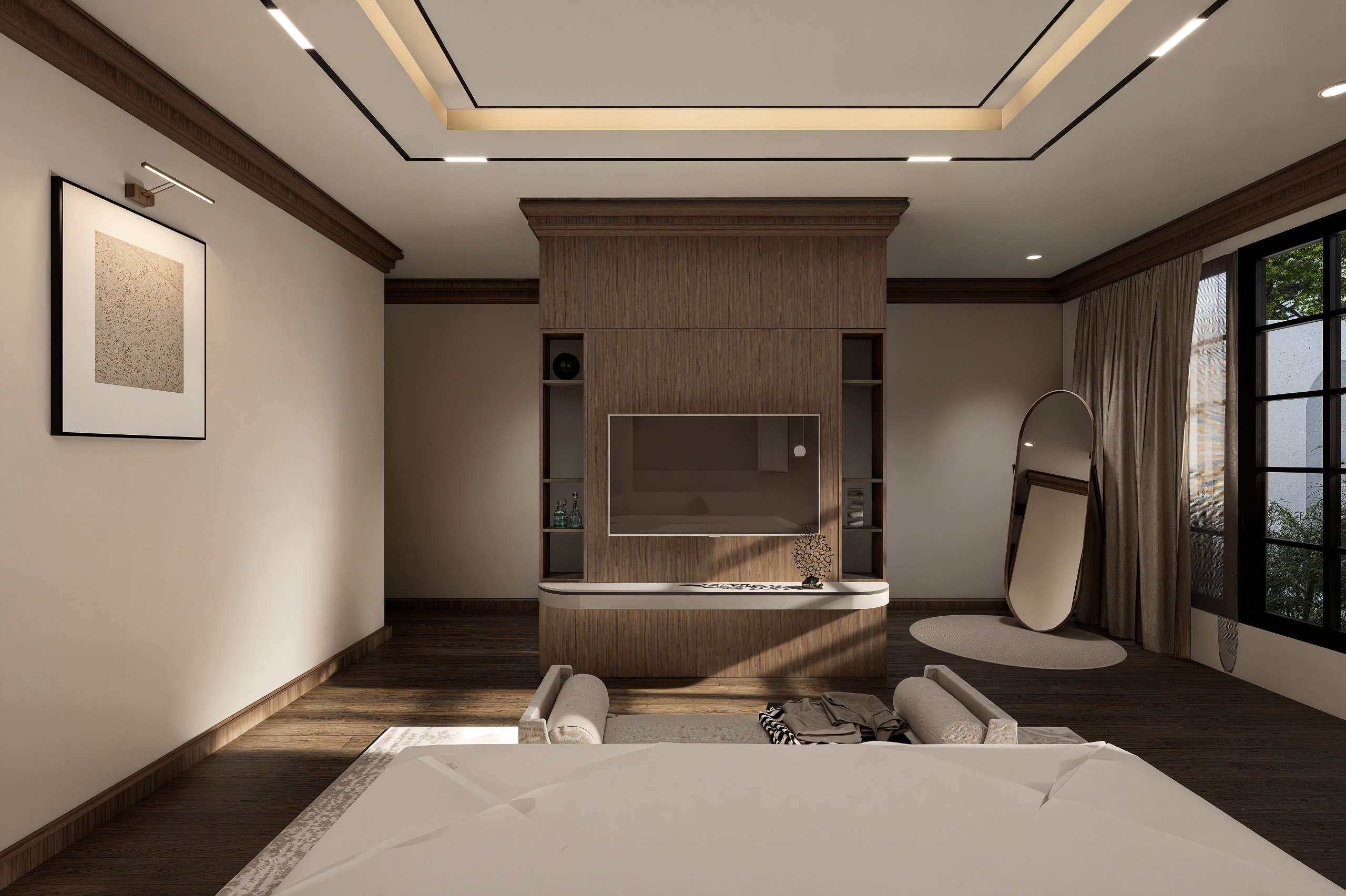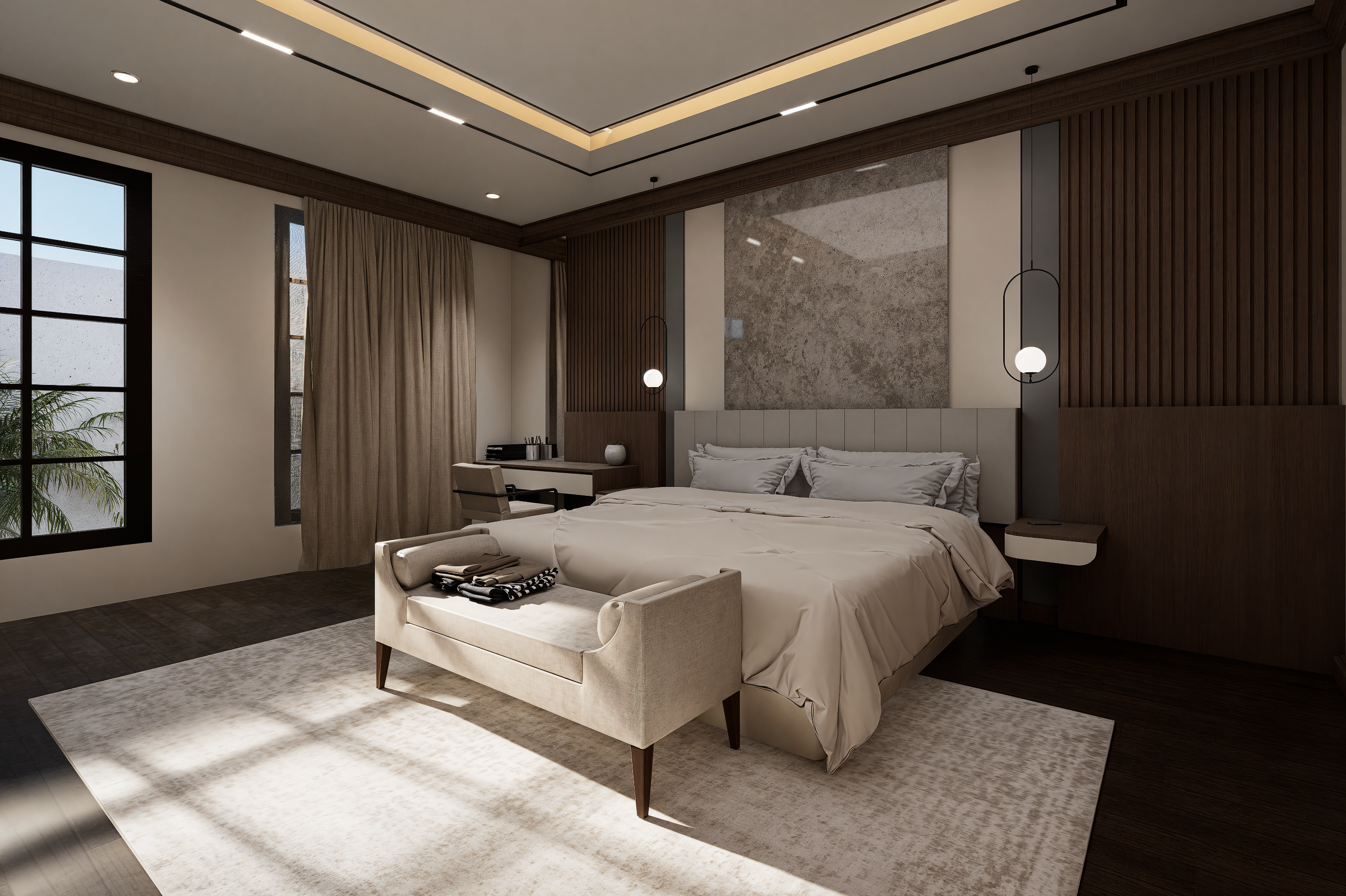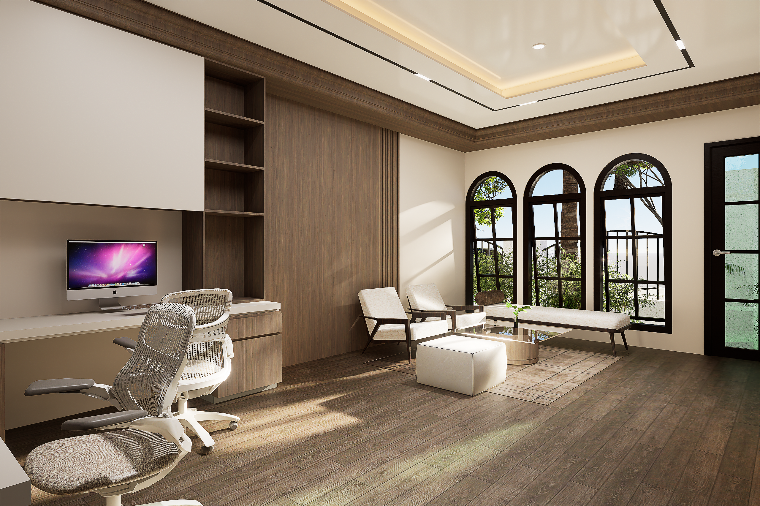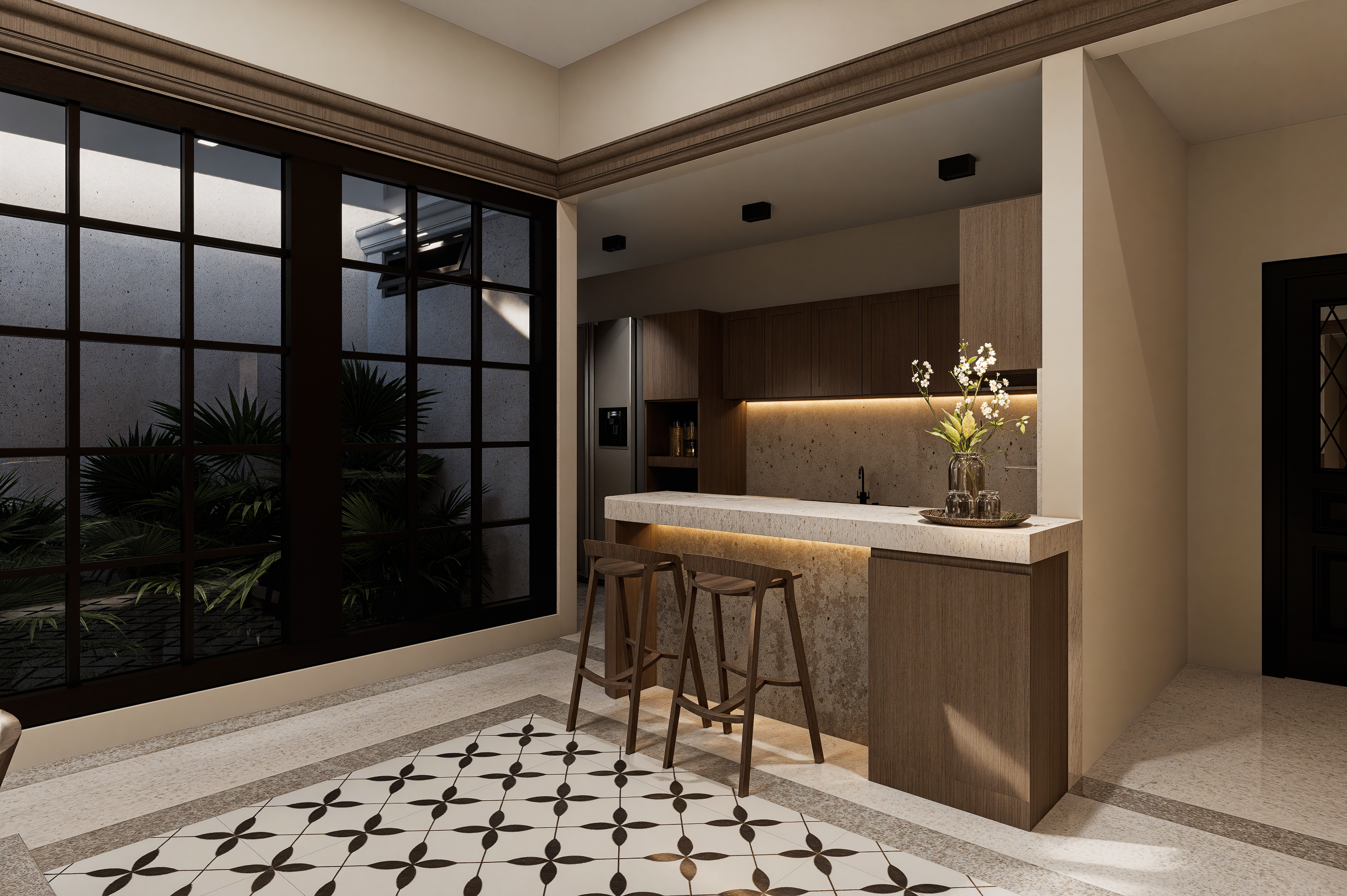 Pendekatan desain dilakukan dengan memaksimalkan lahan terbuka dan orientasi ruang. Tata massa diolah untuk memberi akses yang lapang, dengan ruang-ruang utama diarahkan ke area tengah. Pemilihan material kayu, finishing terang, serta detail klasik pada bukaan memberi nuansa hangat, sementara ceiling tinggi memastikan kenyamanan sirkulasi. Hasil rancangan menghadirkan rumah satu lantai yang lapang, terang, dan bersahabat. Ruang-ruang besar tanpa banyak batasan memungkinkan kegiatan keluarga berlangsung dengan leluasa, sementara karakter classic Mediterranean memberi identitas yang kuat sekaligus timeless.