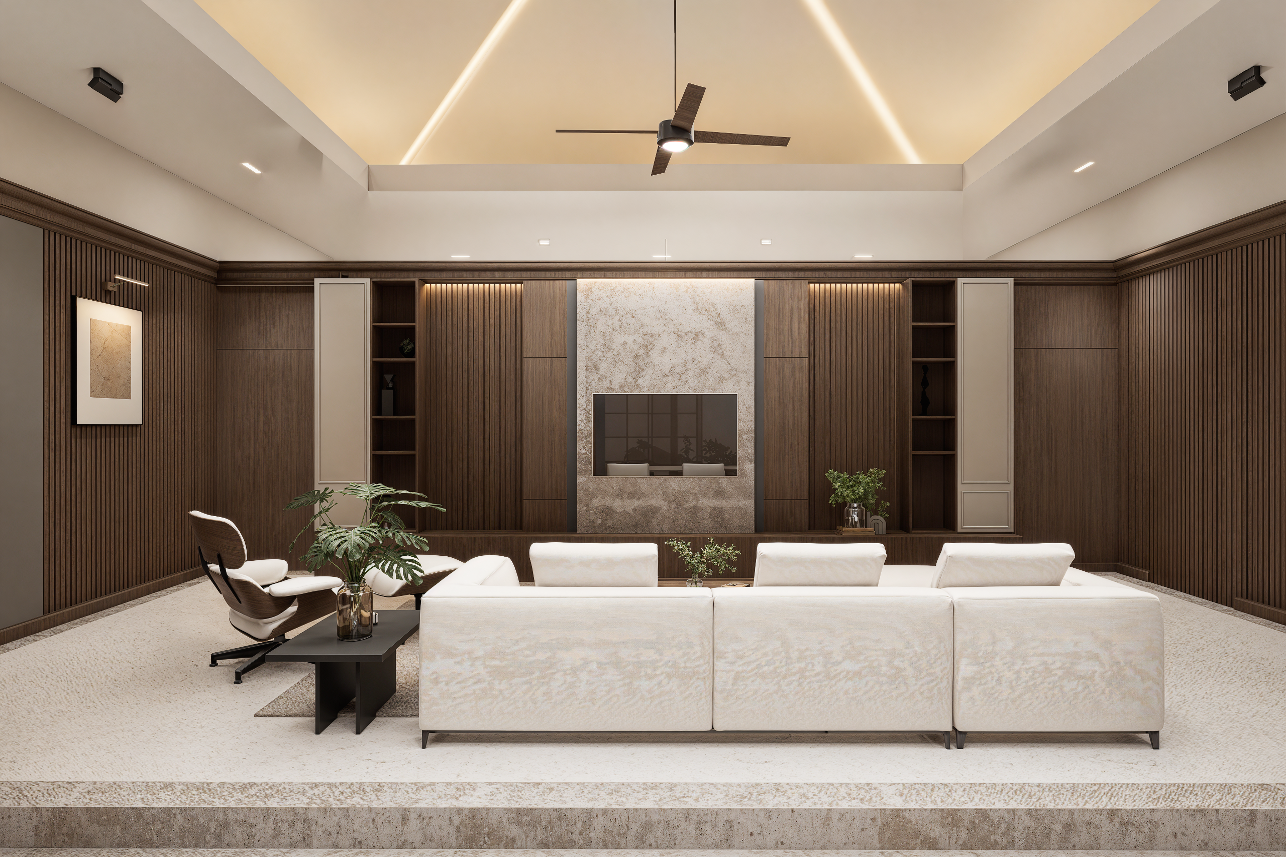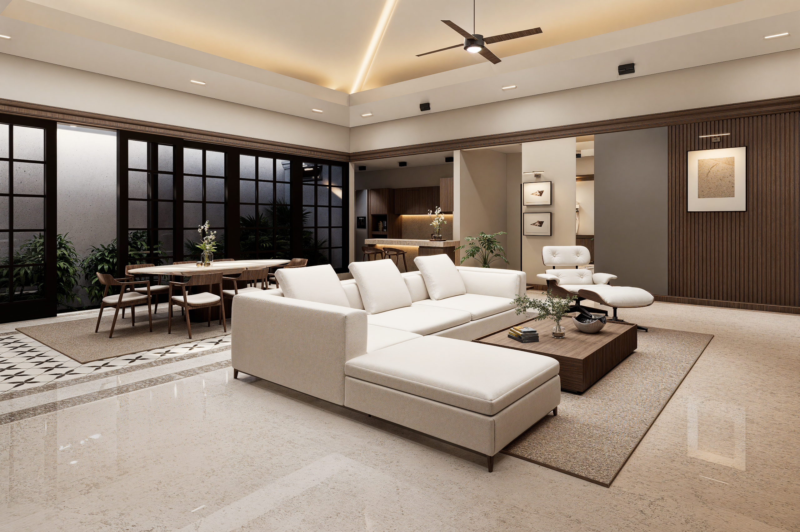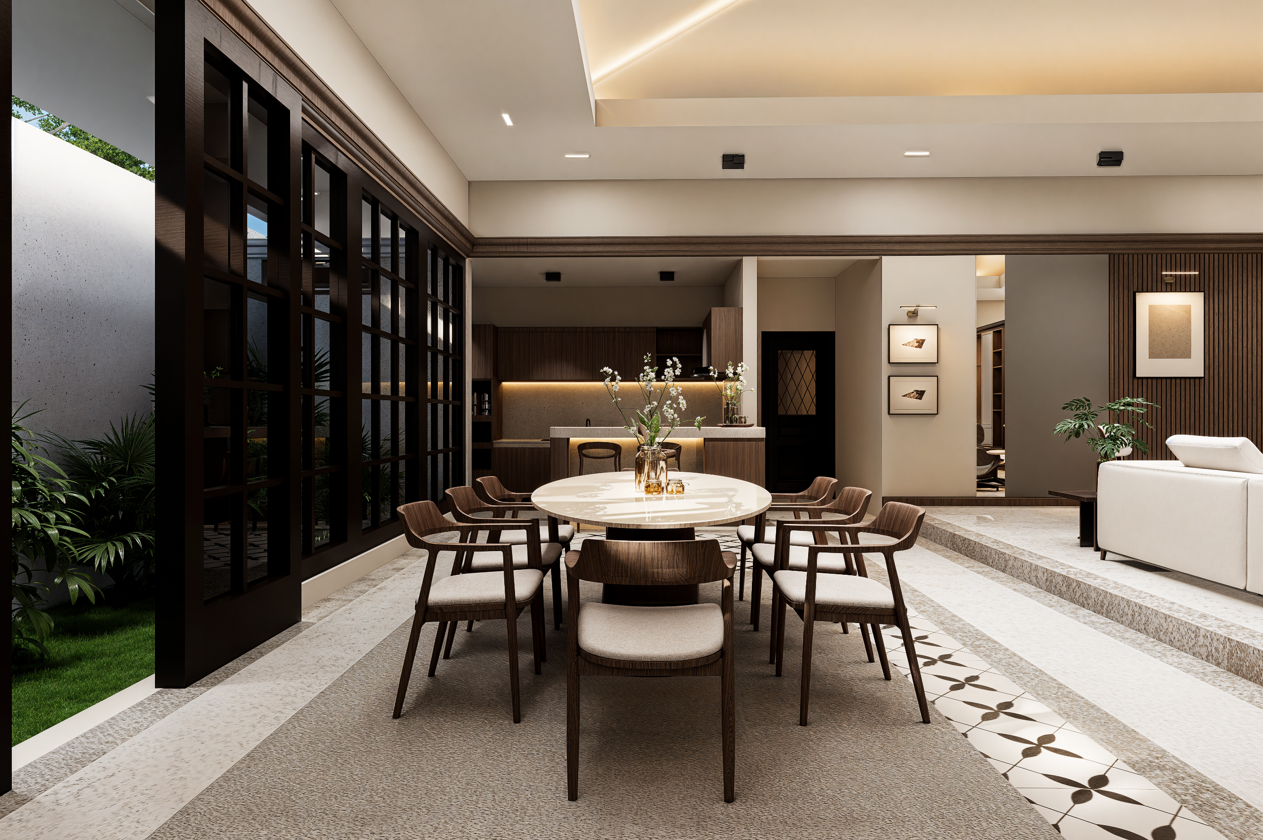 Rumah satu lantai seluas 400 m² ini dirancang untuk pasangan muda yang menginginkan kedekatan dengan keluarga. Konsep ruang berpusat pada area tengah dengan ceiling tinggi, sehingga sirkulasi udara lebih lega dan nyaman. Arah desain dipilih ke gaya classic Mediterranean dengan palet warna putih, krem, dan kayu, serta tata ruang besar yang fleksibel untuk kebutuhan di masa mendatang. Tantangan muncul dari kebutuhan menciptakan rumah luas satu lantai dengan kualitas ruang yang tetap efisien. Selain itu, rumah ini sering menjadi tempat acara keluarga, sehingga rancangan harus mampu mengakomodasi aktivitas bersama tanpa banyak sekat, namun tetap menjaga keseimbangan cahaya dan udara alami.