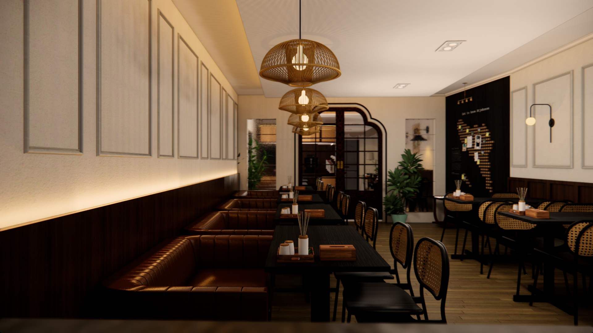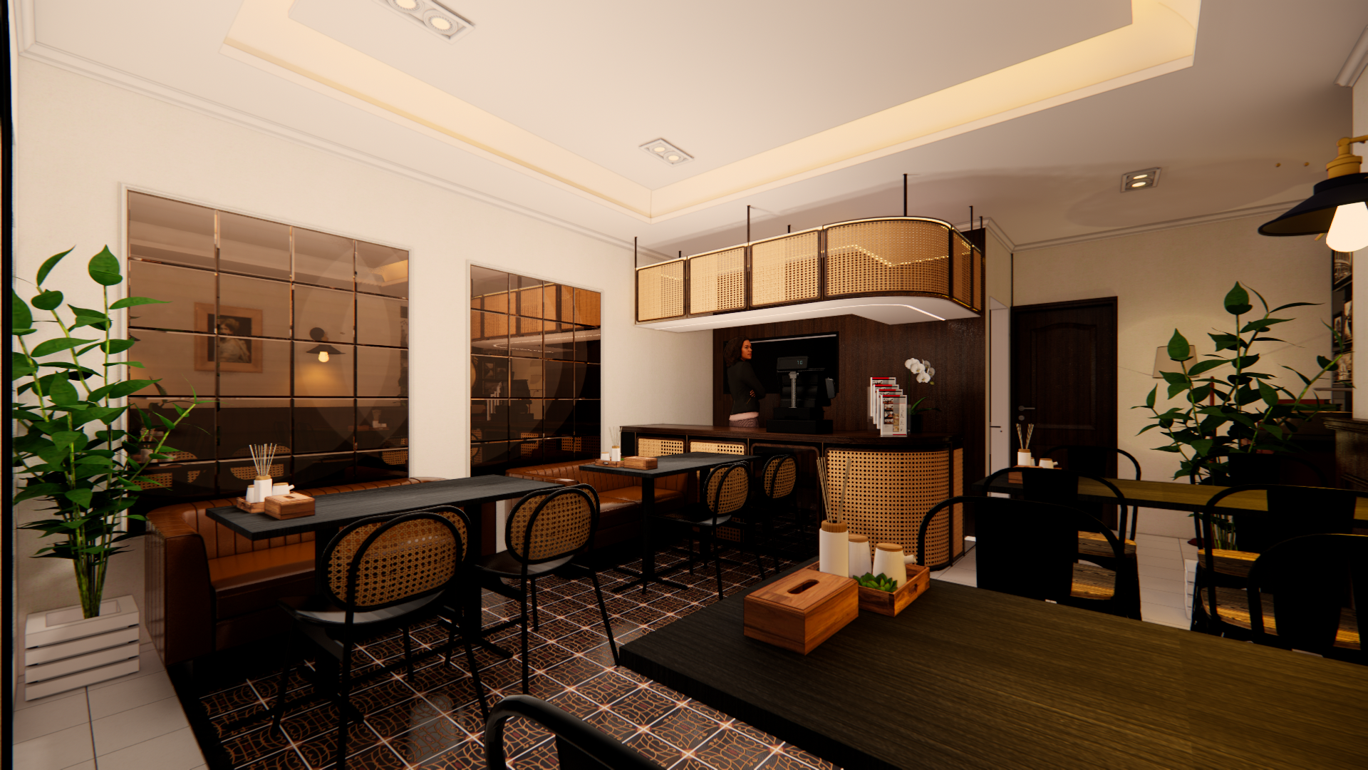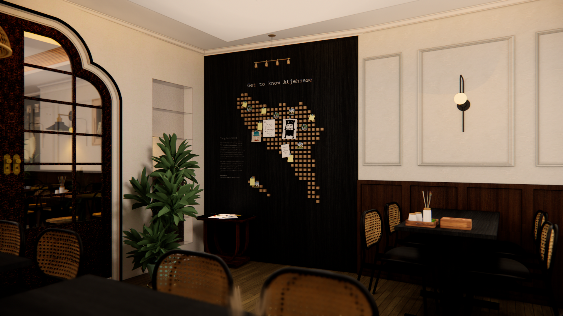 Strategi perancangan diarahkan pada pengalaman visual yang interaktif. Board peta Aceh yang menandai titik persebaran kopi Indonesia dipadukan dengan foto tokoh Aceh, sementara pilihan material kayu gelap, detail moulding, dan furnitur rotan memperkuat nuansa vintage yang hangat. Hasil rancangan menghadirkan atmosfer kafe dengan karakter Aceh yang kuat sekaligus informatif. Ruang tidak hanya berfungsi secara efisien, tetapi juga menjadi media narasi yang menyampaikan cerita tentang Aceh dan kopi Nusantara kepada pengunjung.