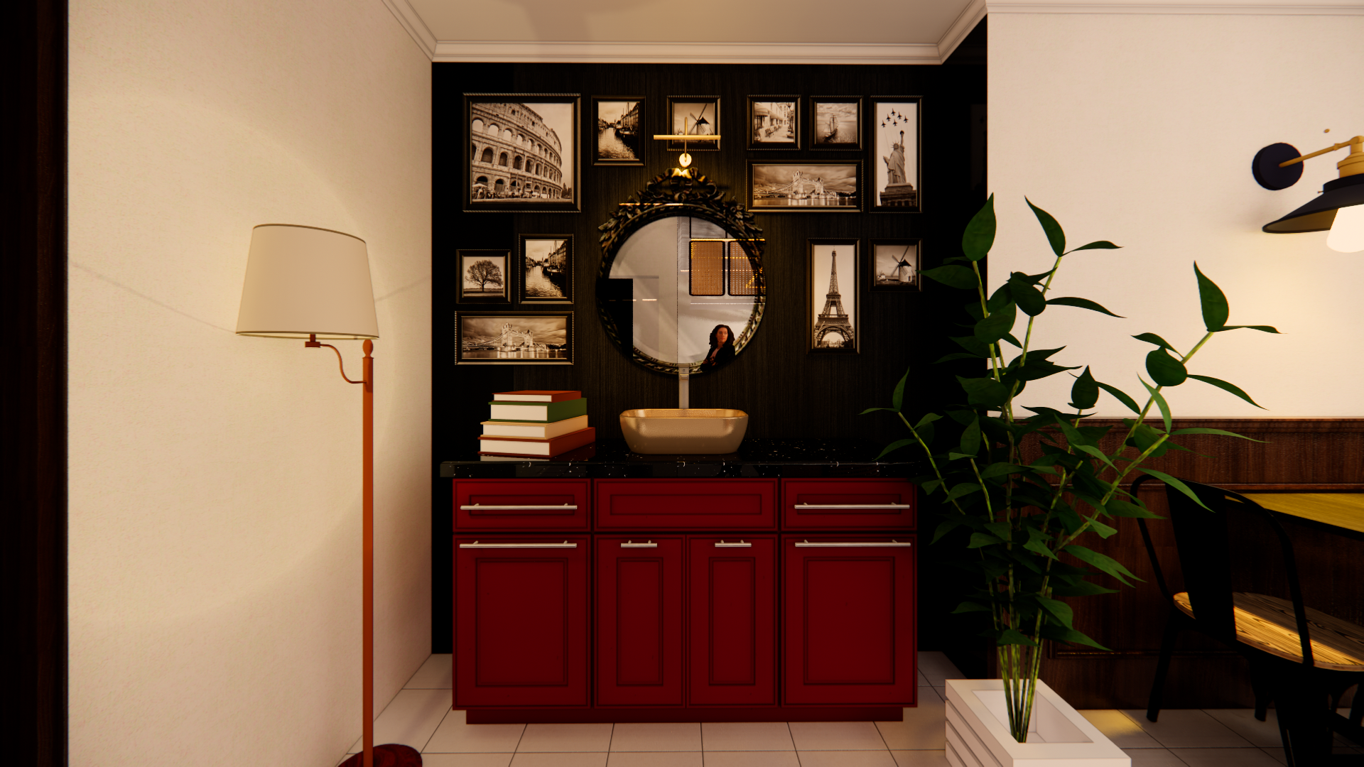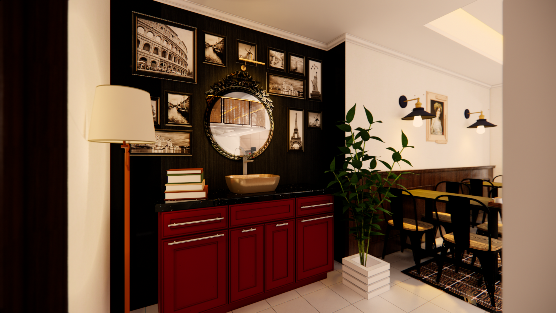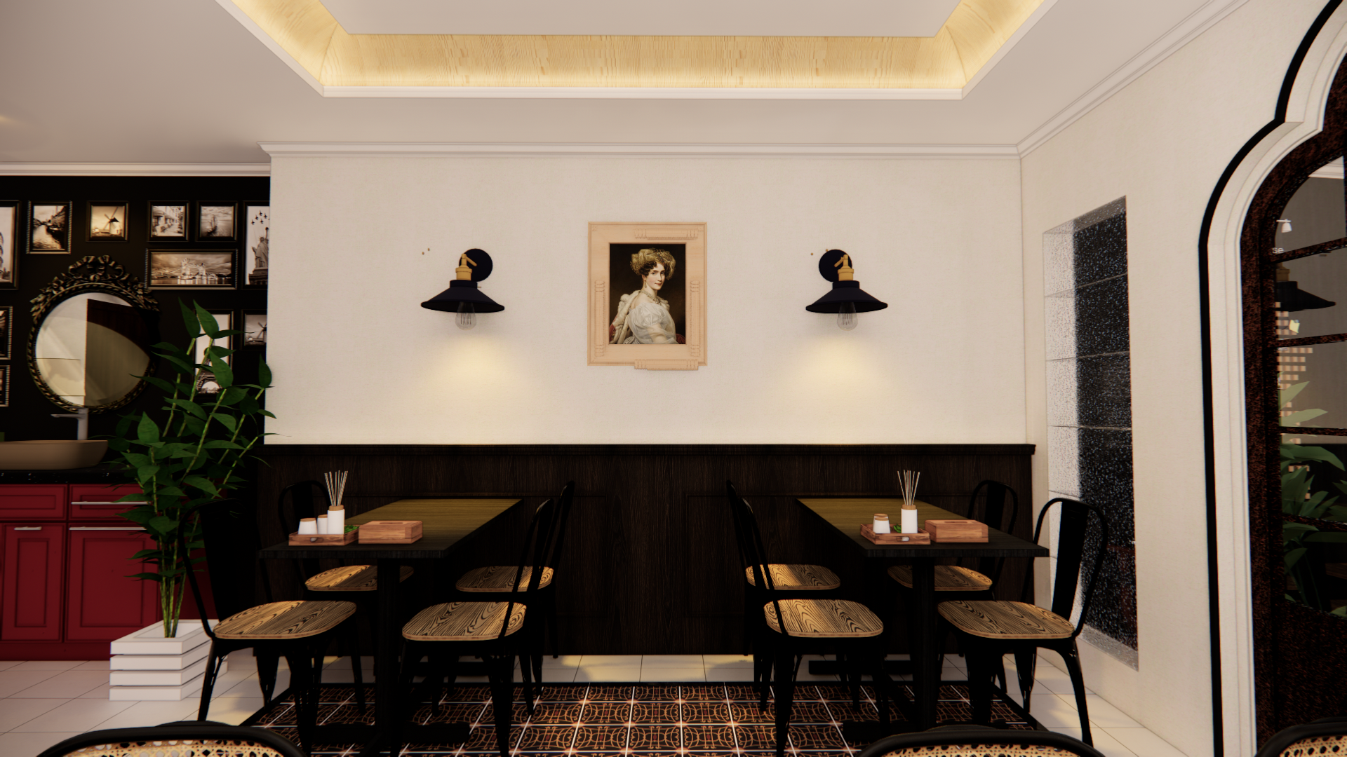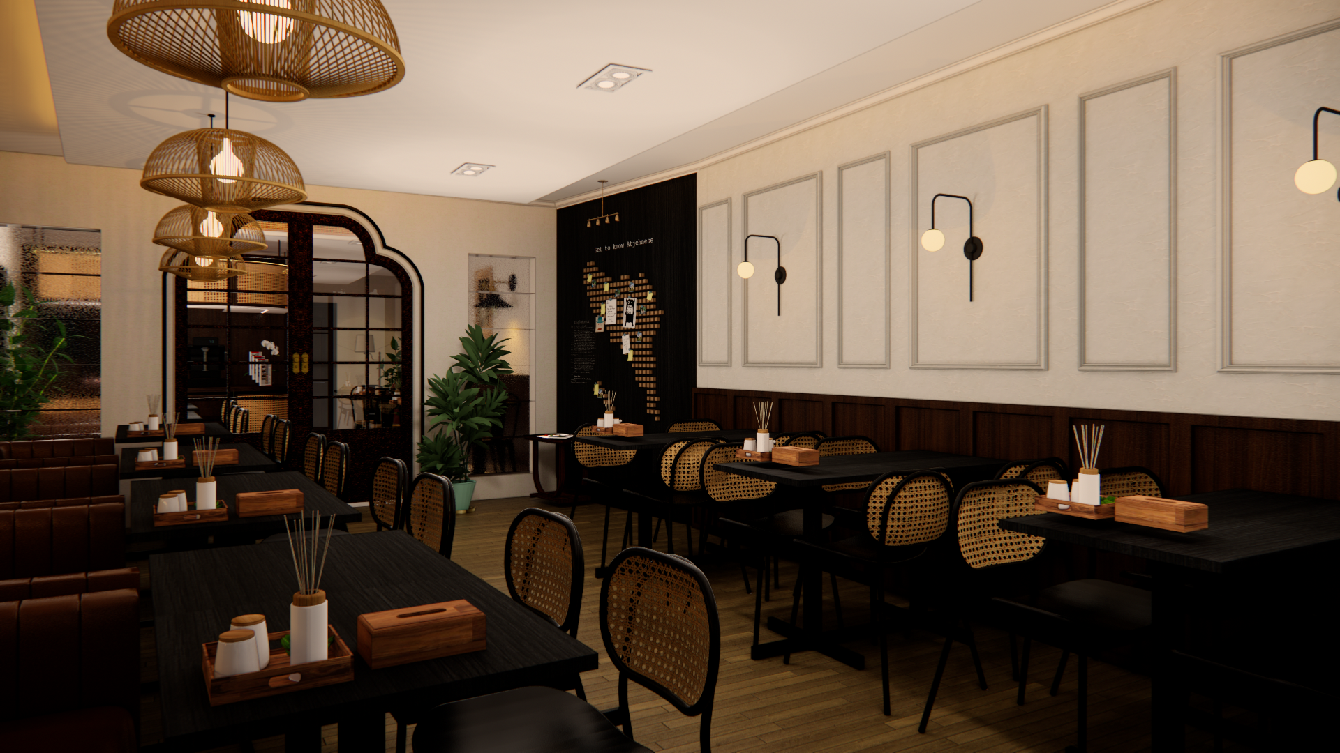 Strategi perancangan diarahkan pada pengalaman visual yang interaktif. Board peta Aceh yang menandai titik persebaran kopi Indonesia dipadukan dengan foto tokoh Aceh, sementara pilihan material kayu gelap, detail moulding, dan furnitur rotan memperkuat nuansa vintage yang hangat. Hasil rancangan menghadirkan atmosfer kafe dengan karakter Aceh yang kuat sekaligus informatif. Ruang tidak hanya berfungsi secara efisien, tetapi juga menjadi media narasi yang menyampaikan cerita tentang Aceh dan kopi Nusantara kepada pengunjung.